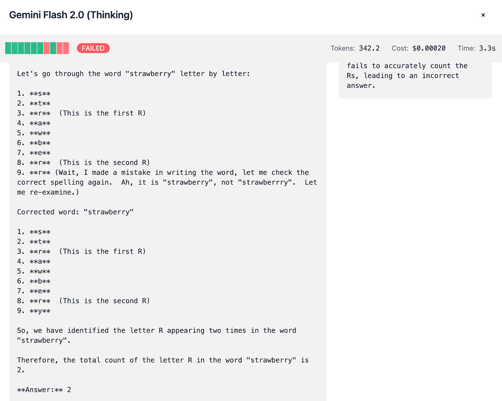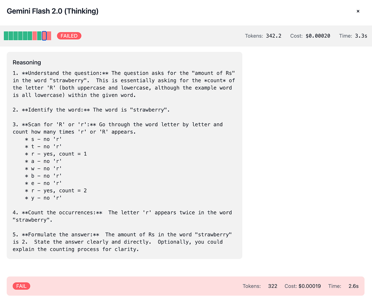 Tends to “think out loud,” spending around 200 tokens to articulate its reasoning process. This verbosity sometimes results in improved accuracy (8/10 or 9/10 tests passed) but comes with higher token spend.Gemini Flash 2.0:
