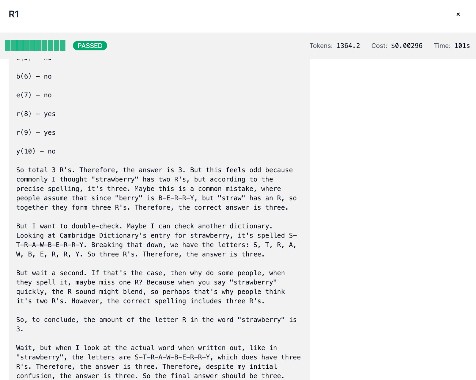 DeepSeek R1, for instance, occasionally “knows” there should be only 2 Rs based on a mistaken internal reasoning yet ultimately outputs 3—highlighting the nature of LLM reasoning.