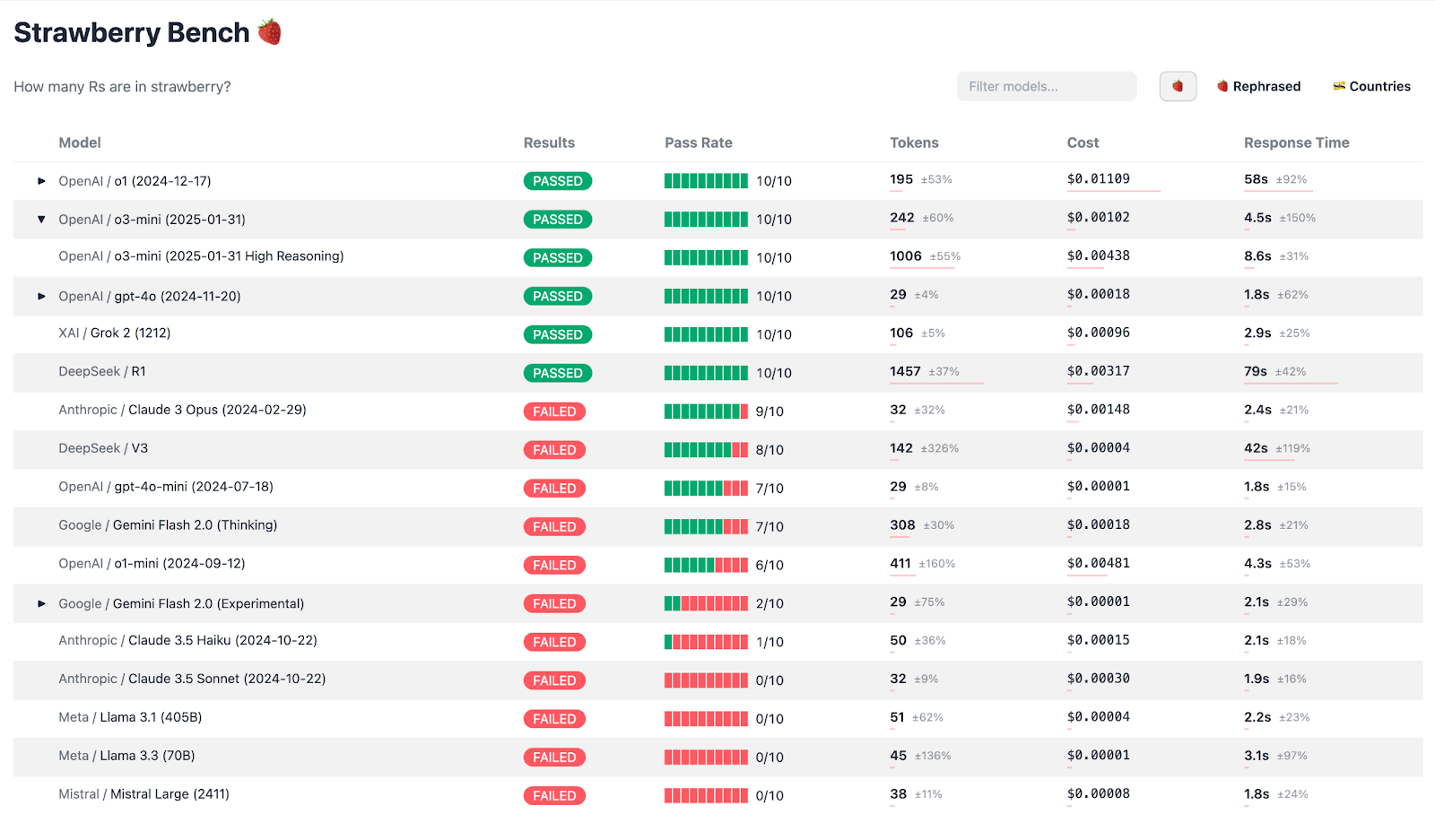 It seems that many models were trained on a variation of the test that had only 2 Rs in strawberry. We also suspect that some other models (like Grok 2) may have been specifically trained to count letters in a word.Accuracy Variations: