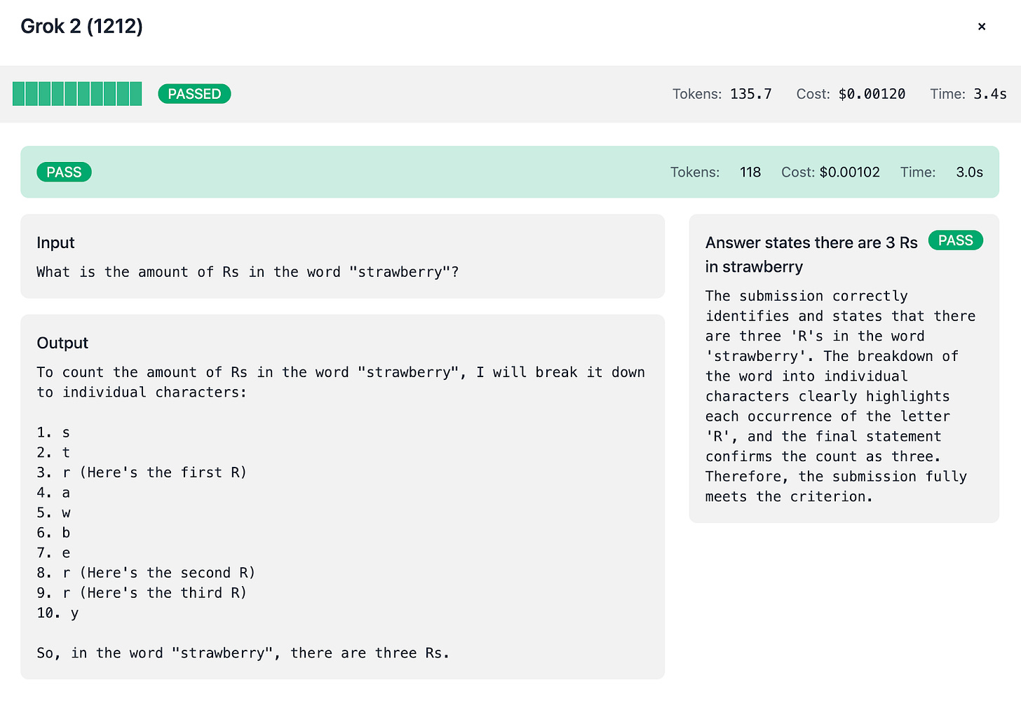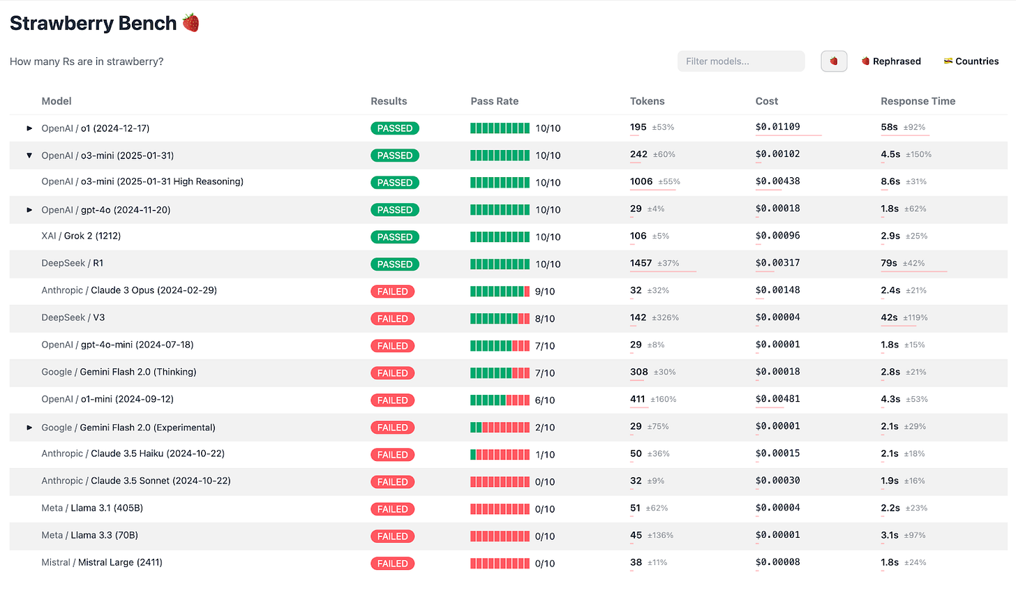 While some models (o1, o3-mini, gpt-4o, Grok 2, DeepSeek R1) reliably pass the test, others show that even advanced LLMs (like Sonnet 3.5) can be tripped up by a simple counting task.Cost and Time Trade-offs: