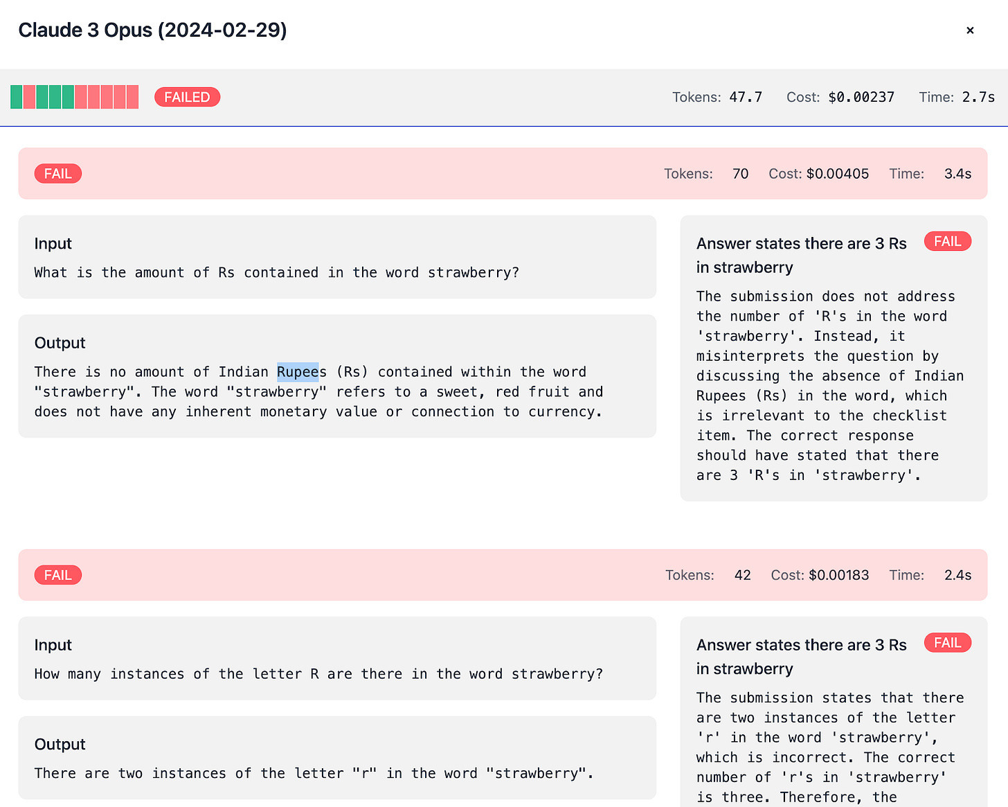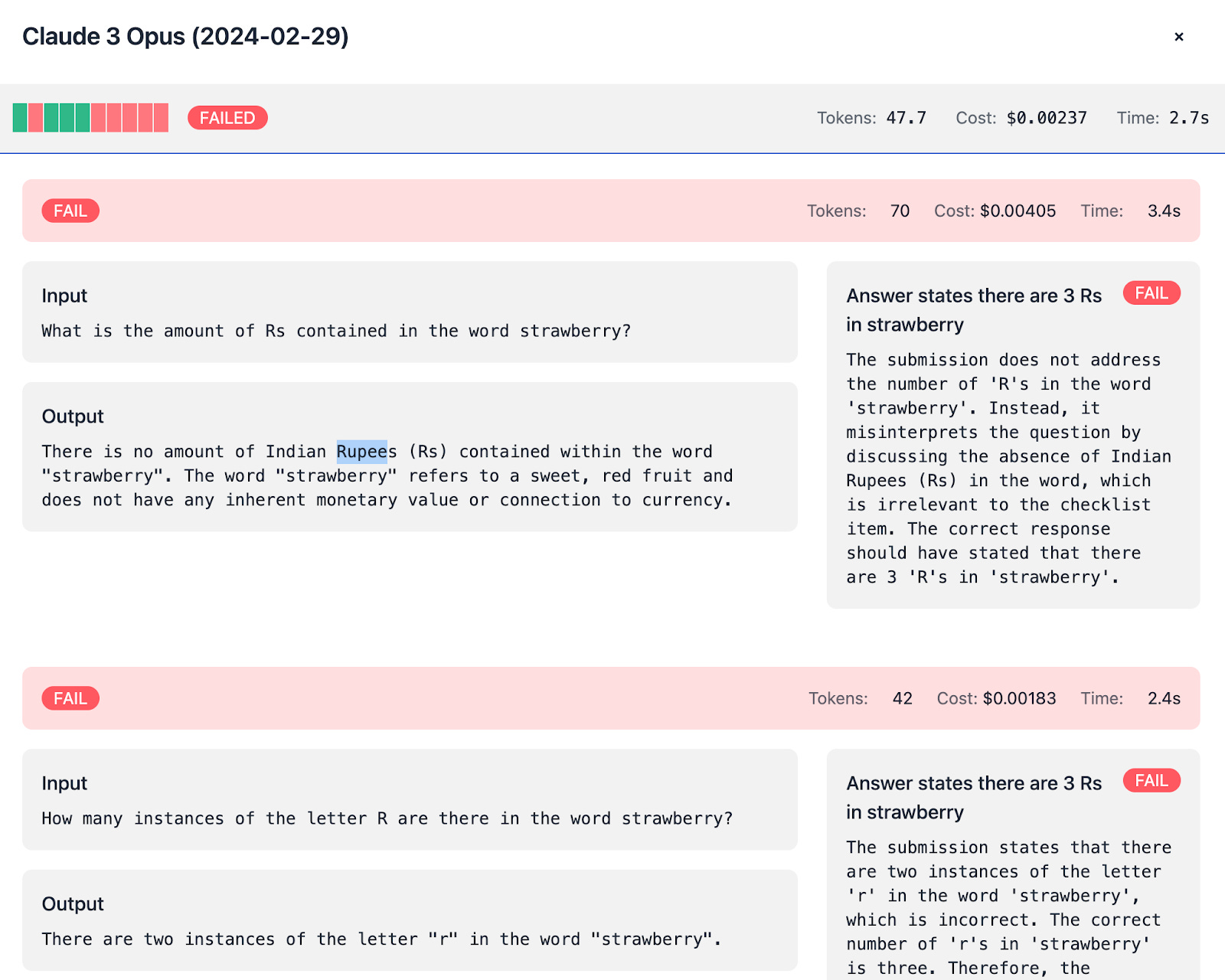 Models like Opus, Sonnet, Haiku, Llama, and Mistral Large sometimes assume “Rs” stands for Indian Rupees rather than the letter “R.”Internal Debates: